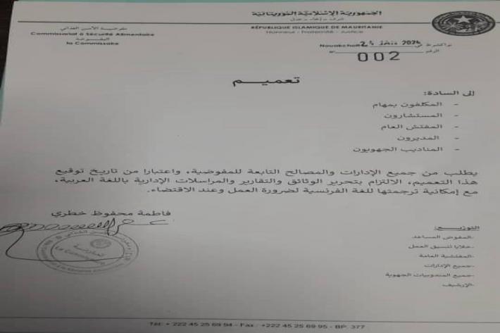 وجاء في تعميم موقع من مفوضة الأمن الغذائي فاطمة منت خطري أن الوثائق والمراسلات يمكن "ترجمتها إلى الفرنسية عند الاقتضاء".